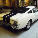 Le modèle présenté ici est de 1966, blanche avec bandes lemans bleues et jantes cragar